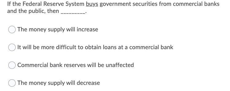 Banks will be able to make additional loans. If the Federal Reserve System buys government securities from commercial banks and the public then The money supply will increase It will be more difficult to obtain loans at a commercial bank Commercial bank reserves will be unaffected The money supply will decrease.