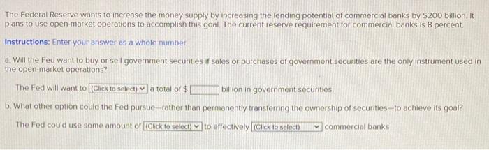 Economics questions and answers. The Federal Reserve buys and sells government securities to control the money supply and interest rates. Commercial bank reserves will decline.