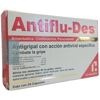 Su fórmula a base de tres componentes. Su fórmula a base de tres componentes está diseñada específicamente para el tratamiento de la gripa o influenza tipo A y aliviar los malestares que ésta produce. Es importante que no se automedique y que acuda siempre con un profesional de la salud. Antiflu-Des el mejor antigripal solo en Sanborns. TODOS LOS DERECHOS RESERVADOS POR COMERCIALIZADORA FARMACÉUTICA DE CHIAPAS SAPI. Antiflu-Des Jr may be available in the countries listed below. ANTIFLU-DES está indicado en el tratamiento de la gripe. ANTIFLU-DES JR es una solución infantil antigripal con acción antiviral especifica. ANTIFLU-DES no deberá administrarse a personas de edad avanzada o personas que tienen antecedentes de trastornos psíquicos o convulsiones pacientes con trastornos hepáticos renales con hipertiroidismo e hipertensos sin control epilepsia glaucoma miastenia grave hipertrofia prostática pacientes en tratamiento con inhibidores de la MAO o.