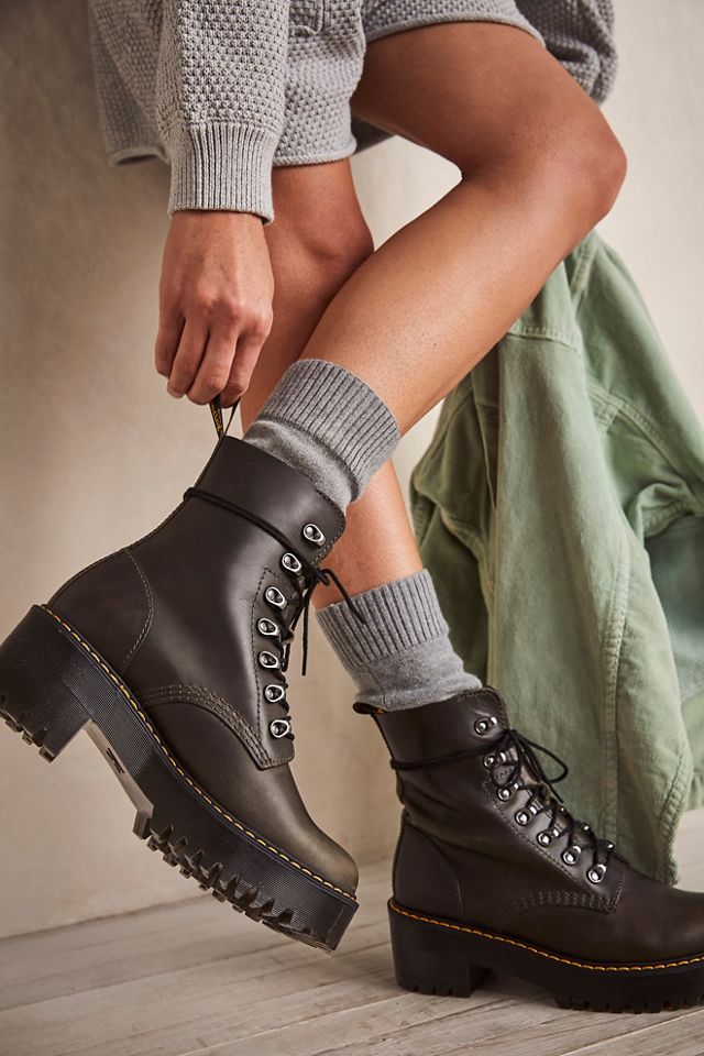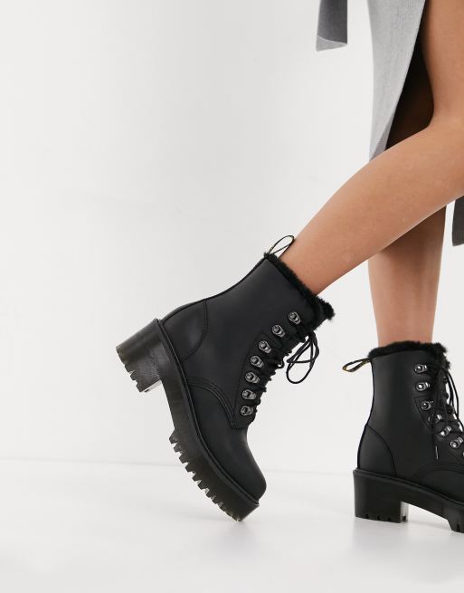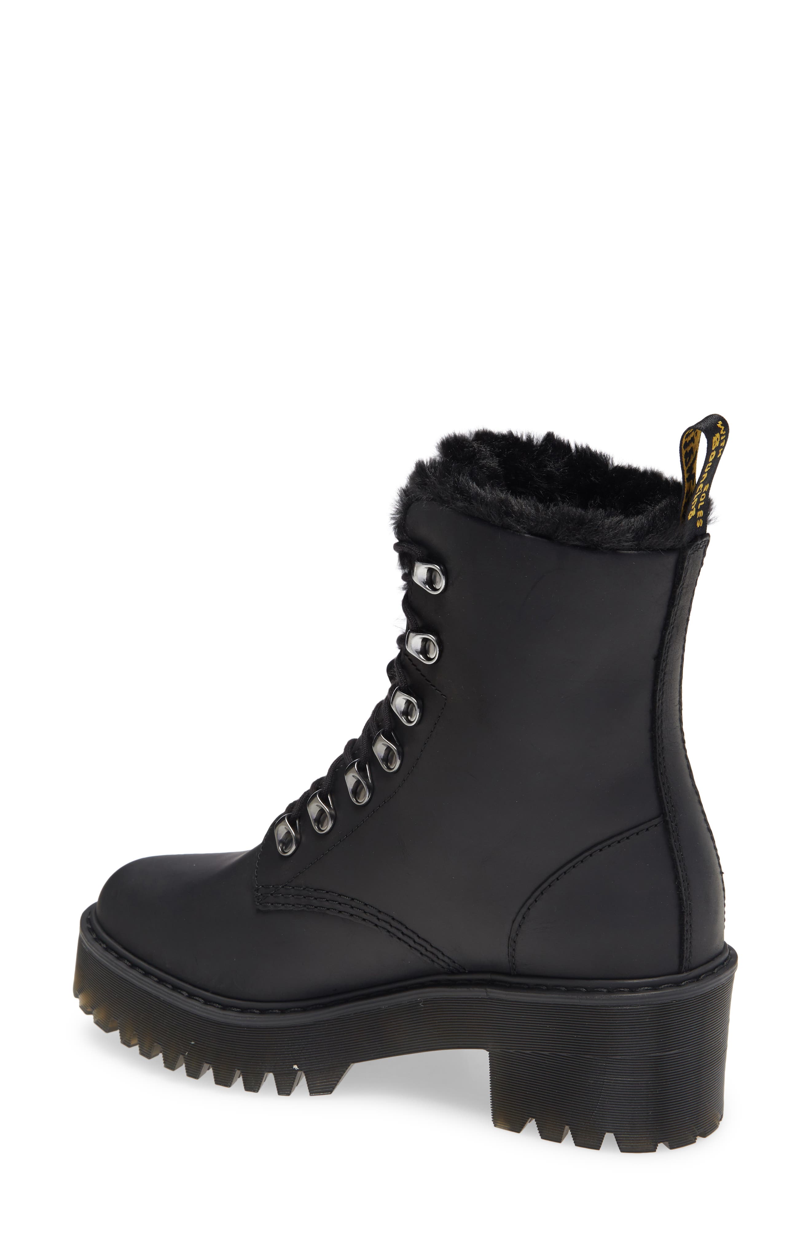 Special Price 21249. Leona Faux Fur Platform Leather Boots - Black. The tough heeled boots sit on a stacked air-cushioned sole and come detailed with hiker-inspired eyelets and our signature AirWair heel loop.
